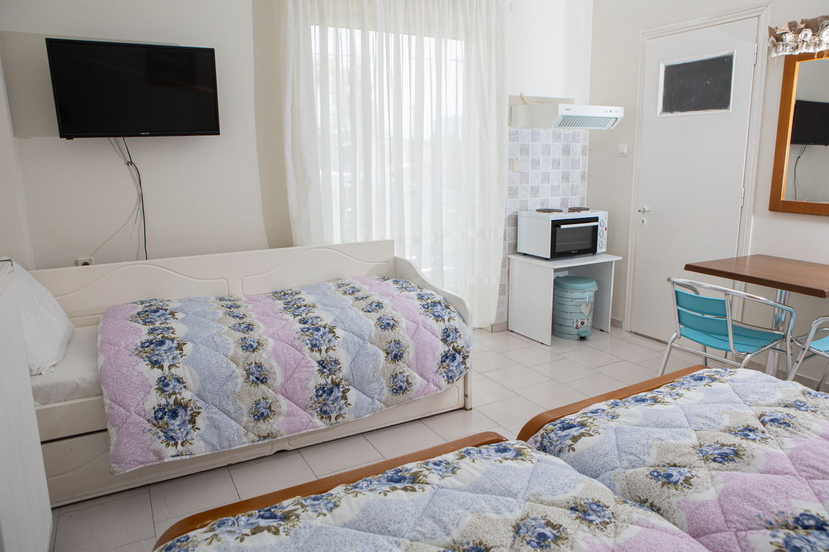 Διαθέτουμε στούντιο με 2-3 κρεβάτια, κουζίνα, μπάνιο και μπαλκόνια. Είναι εξοπλισμένα με ψυγείο, φούρνο, βραστήρα, τηλεόραση και Air Contition.